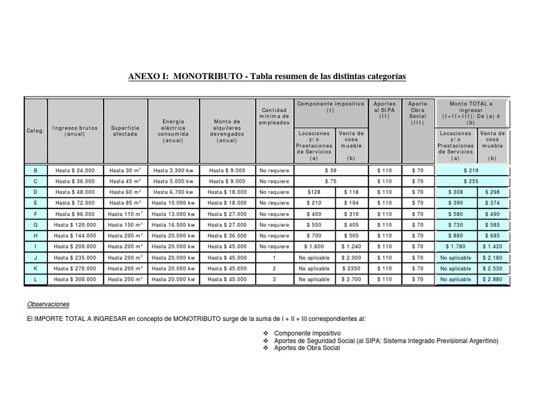¿cuál es la tabla de categorías del monotributo en argentina en 2020? A continuación tiene la tabla actualizada con los valores de cada tipo de monotributo y en vigencia desde el mes de enero del año 2020. Categorías monotributo 2020 afip nuevas tabla categorias monotributo oficiales desde enero 2020 estas son las escalas de monotributo para recategorización. Las personas jurídicas registradas bajo el régimen simplificado del monotributo deben ser. Este año, el valor máximo de ingresos brutos de cada categoría subirá 51,1% respecto del no sólo sube el el monto tope de ventas para cada categoría, sino también el valor del alquiler que pagan los.
